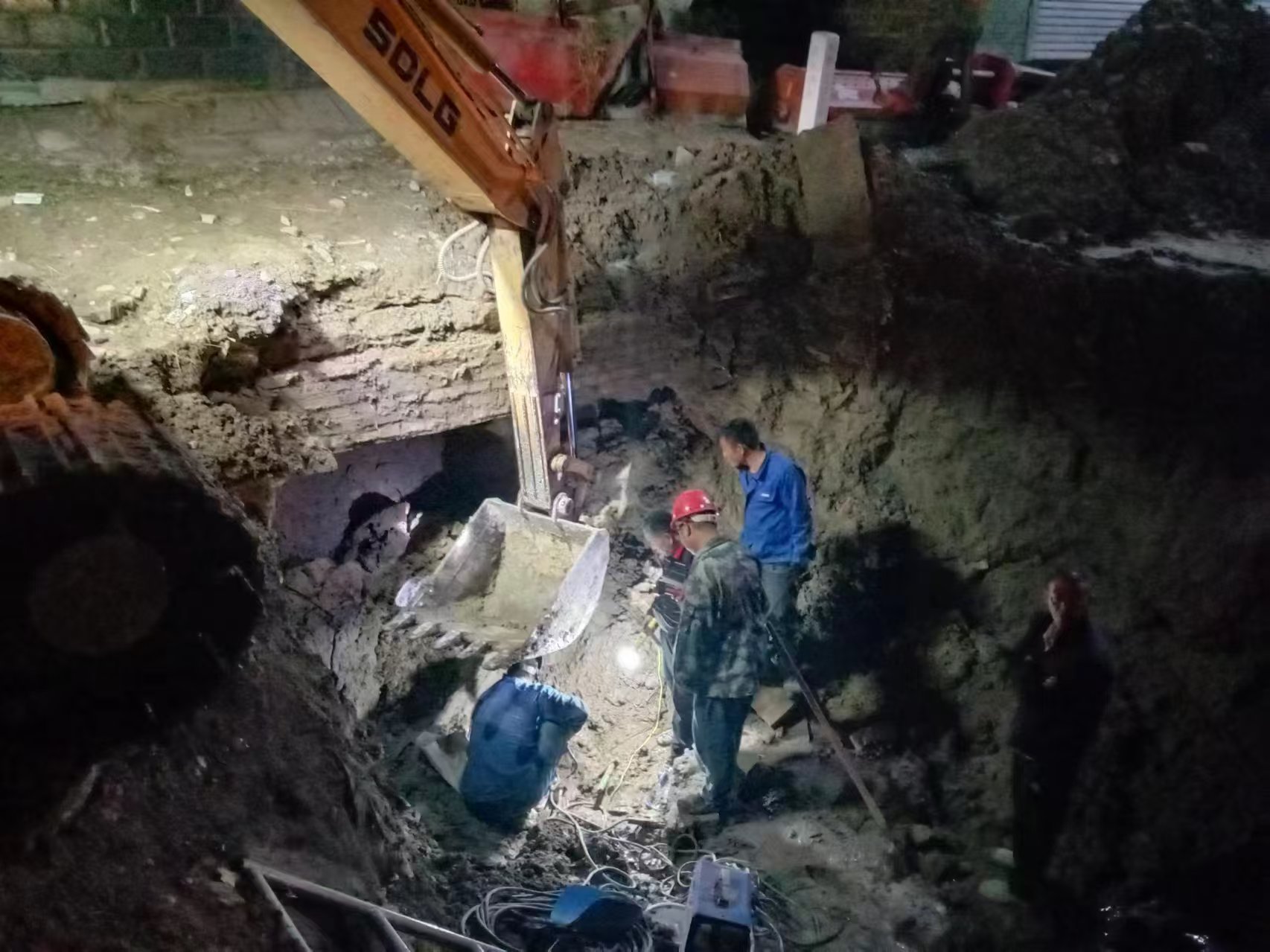 面對緊急情況,公司相關技術人員依據(jù)現(xiàn)場勘查結果,迅速制定了搶修方案。由于破裂管道處南側是村民自建的房屋,北側是村民出入的主要通道及高壓供電線路,西側有天然氣管線,施工難度較大。在地方村委及相關人員的大力支持配合下,施工隊伍采取必要的安全防護措施后,搶修工作全面展開。