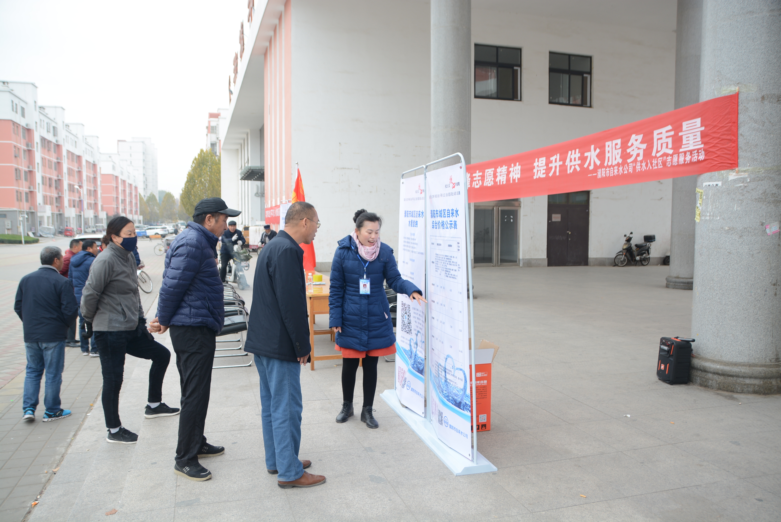 為扎實(shí)開展“不忘初心 牢記使命”主題教育,濮陽市自來水公司按照“守初心、擔(dān)使命、盡職責(zé)、服好務(wù)”的部署要求,11月26日上午,皇甫營業(yè)所組織8名志愿服務(wù)人員到林?;▓@二期,開展“供水服務(wù)入社區(qū)”志愿服務(wù)活動,主動征求居民用戶意見建議,認(rèn)真查找自身工作中存在的短板和不足,下大力氣提升服務(wù)質(zhì)量。現(xiàn)場向小區(qū)居民講解“濮陽市自來水公司”微信公眾號操作使用,為居民用戶講解安全供水知識,宣傳供水政策法規(guī),解答用戶咨詢和疑難問題。4個工作組共接待用戶咨詢100余人次,發(fā)放供水服務(wù)指南100余份,指導(dǎo)用戶使用微信公眾號60余人次,解決用戶家中問題9個,深受居民用戶一致好評,以實(shí)際行動踐行興水為民的莊重承諾。