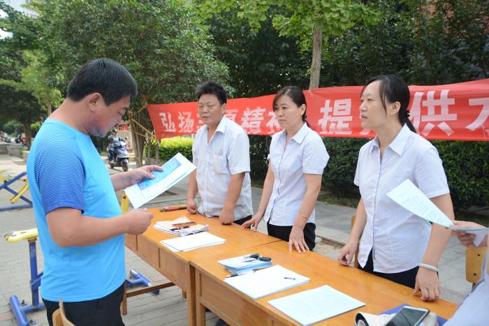 入夏以來,居民用水量增大,用水各種問題也隨之而來,為了給廣大居民日常生活用水排憂解難,使居民放心用水、輕松用水。濮陽市自來水公司持續(xù)開展供水服務進社區(qū)活動,活動中,供水志愿者與社區(qū)居民零距離接觸,耐心解答居民關(guān)心的水價、水質(zhì)、水壓、抄表、收費等問題,同時向現(xiàn)場來訪的居民演示了檢測水質(zhì)的方法,填寫了供水服務征求意見表,居民可對供水壓力、水質(zhì)、抄收員服務態(tài)度、供水設施維修搶修等進行評價。據(jù)了解,本次活動共計發(fā)放用戶服務指南93冊,《河南省城市供水管理辦法》宣傳冊55本,填寫供水服務征求意見表32張,均為滿意。