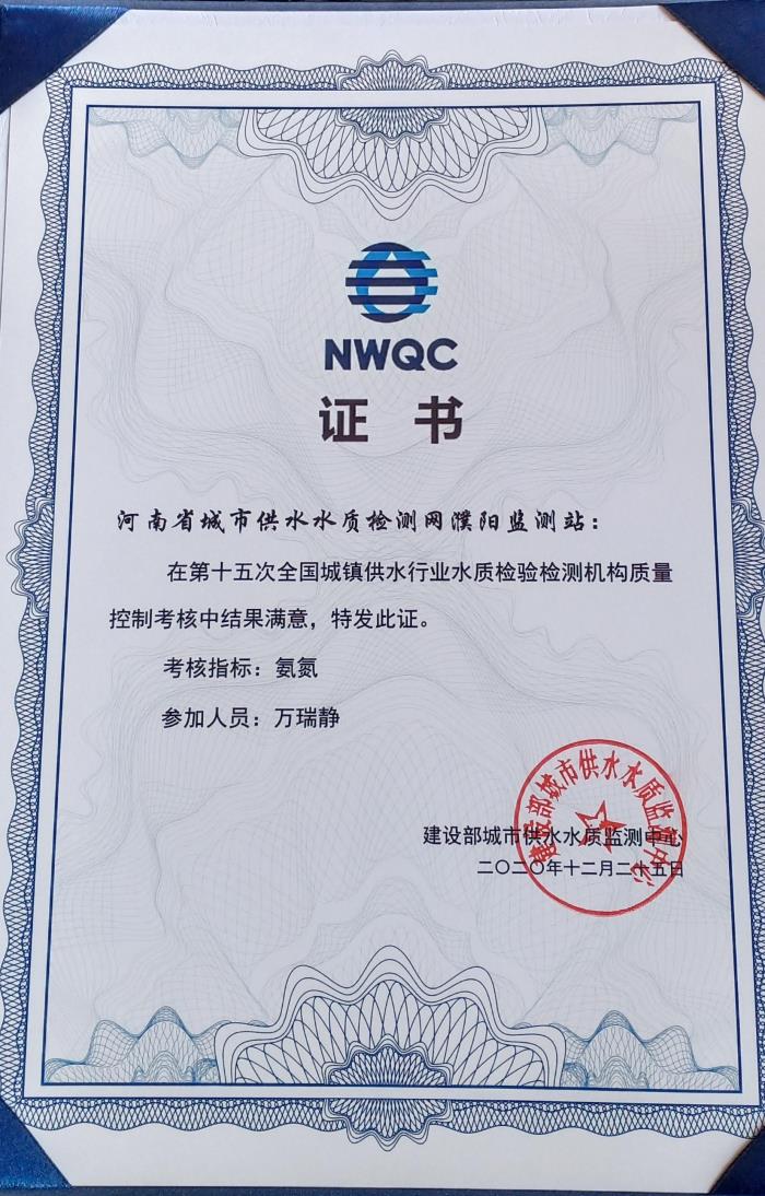 近日,由建設部城市供水水質監(jiān)測中心組織的第15次全國城鎮(zhèn)供水行業(yè)水質檢驗檢測機構質量控制考核結果反饋,濮陽市自來水公司水質監(jiān)測中心參加考核的“生活飲用水中氨氮”指標2個樣品均獲滿意結果,順利通過全國質量控制考核。