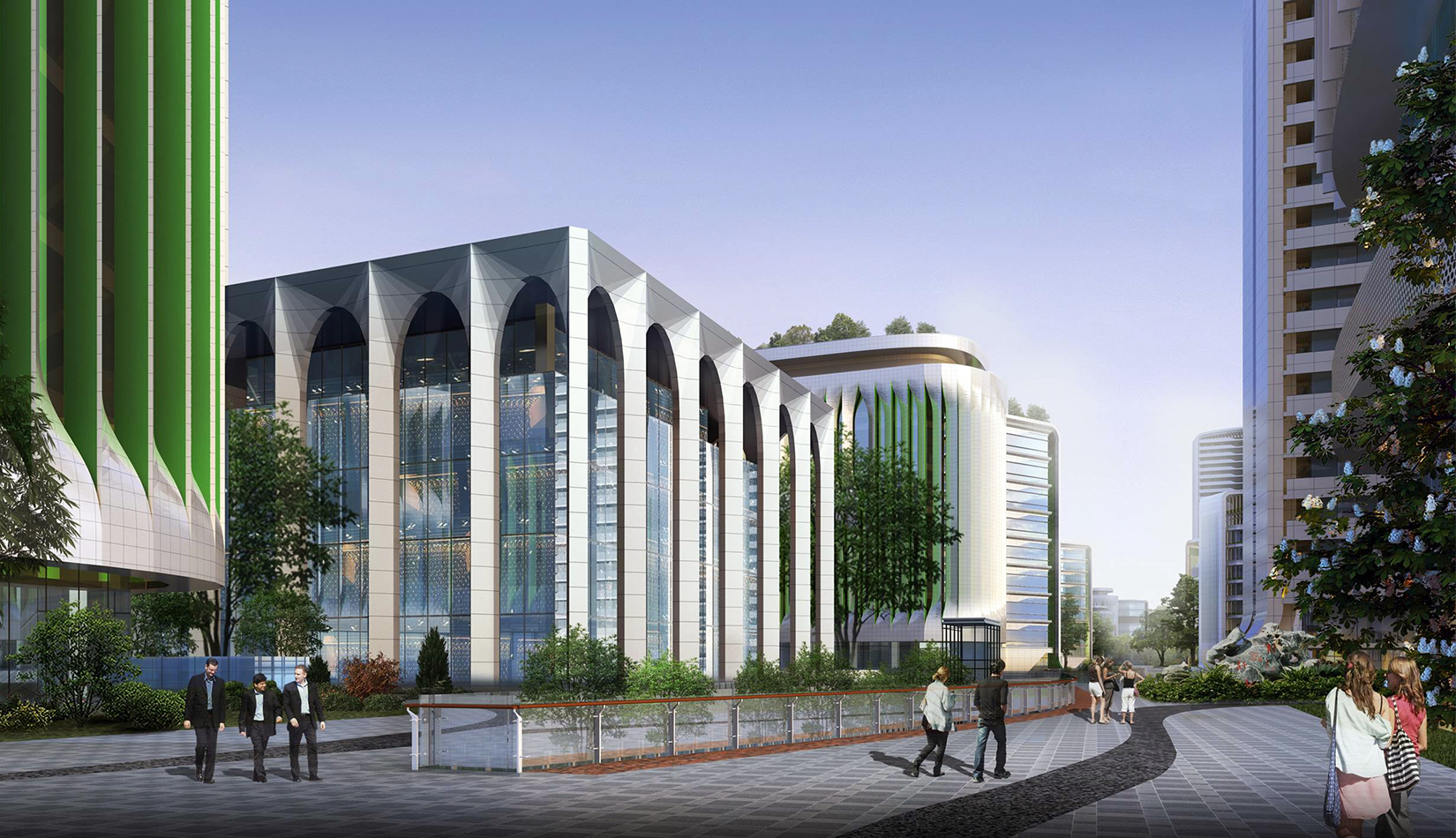 整個(gè)園區(qū)內(nèi),散落著五個(gè)獨(dú)特的建筑單體,分別以不同的顏色代表五大洲建筑形象,與五環(huán)顏色相匹配。象征著院士們來(lái)自于五湖四海,匯聚在院士港這個(gè)港灣。