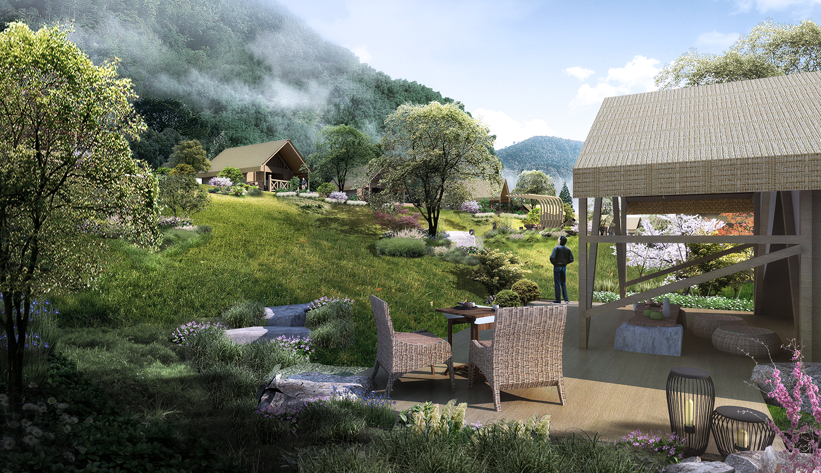 景觀設計從野奢度假酒店的“野”和“奢”兩字入手,融入荒野生態(tài)的設計理念,又要與場地相融合、與原生態(tài)相映、與當地的民俗風情相交匯,突出當地的文化主題,強調高品質的自然、野奢度假,從而打造出一個具備個性與特色,使游客能夠享受到自然野趣體驗的景觀環(huán)境。