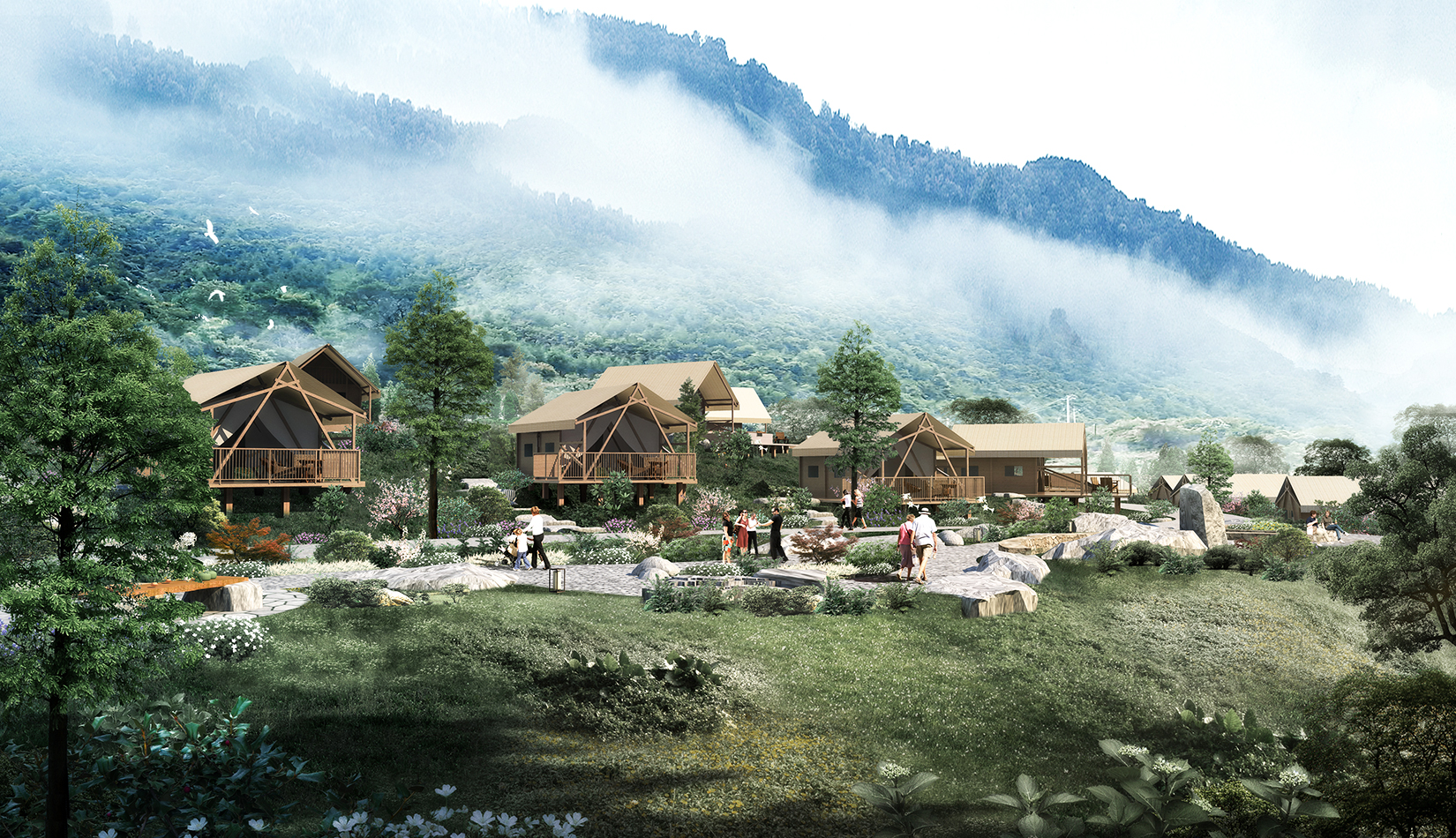根據基地的地勢分布及功能需求,空間結構上分為“一帶兩軸三核心五組團”。建筑設計的五個組團,分別是濱水休閑組團、水畔風光帳篷組團、高端養(yǎng)心帳篷組團、中心服務組團及山居野趣帳篷組團??头坎糠植捎脦づ穸燃傥莸姆绞剑癸@野奢度假的浪漫形式。
