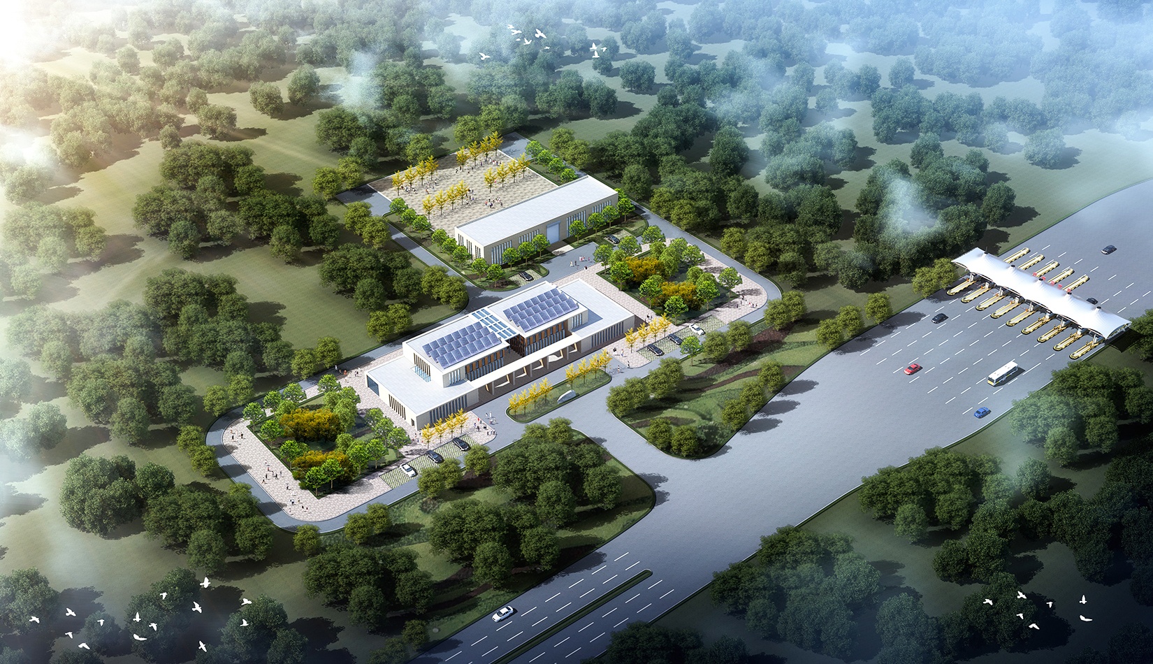 新機(jī)場高速公路是膠東國際機(jī)場集疏運系統(tǒng)的重要組成部分,是連接我市主城區(qū)的迎賓大道。主線收費廣場作為青島的門戶,旅客來青的第一印象,方案設(shè)計充分體現(xiàn)青島城市特征,建筑形式與新機(jī)場航站樓“海星”造型相互呼應(yīng),從“建筑風(fēng)格、視覺傳達(dá)、空間感受”三個方面完善方案設(shè)計,遵從生態(tài)環(huán)保原則,實現(xiàn)收費雨蓬、站房、生態(tài)環(huán)境協(xié)調(diào)統(tǒng)一,結(jié)合地域特色與地產(chǎn)描畫,展現(xiàn)城市海洋文化。