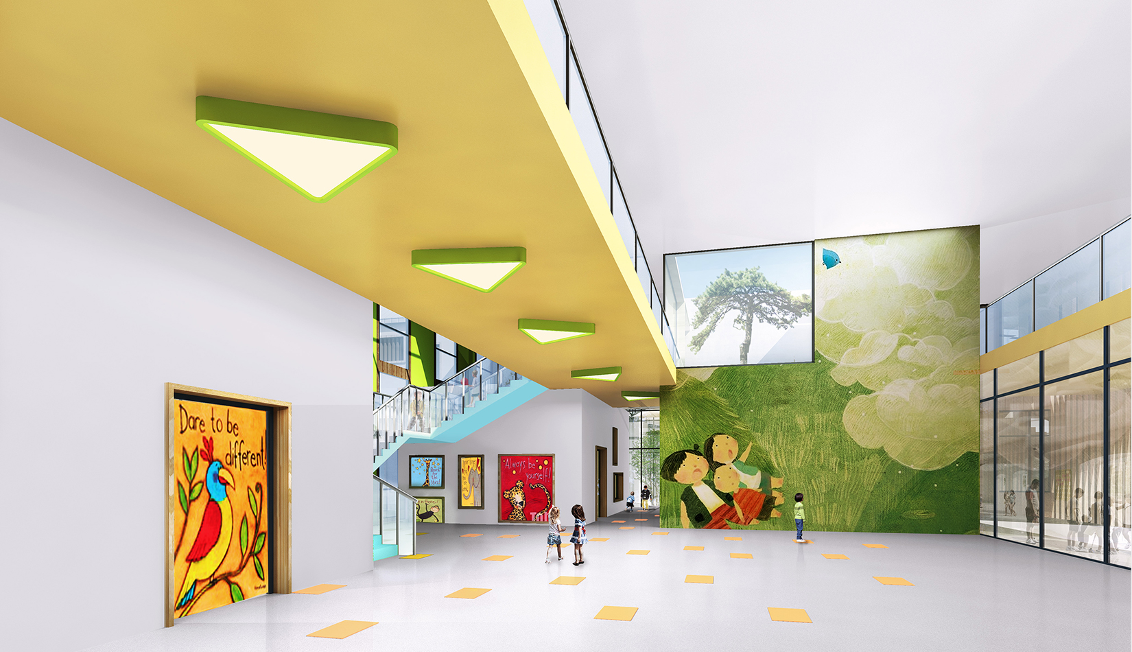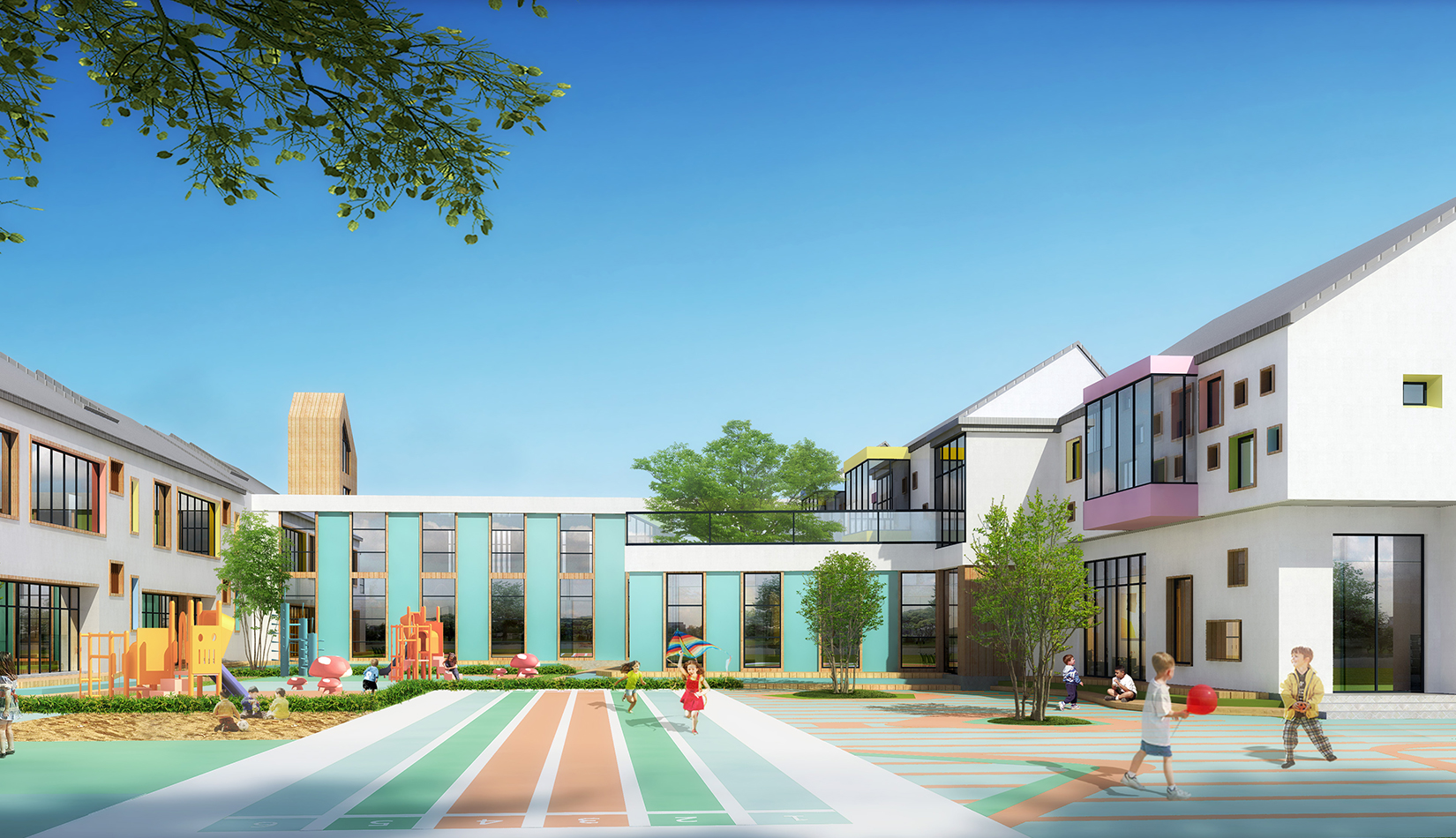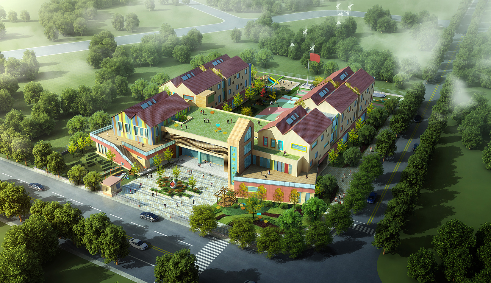 建筑造型來(lái)源于兒童最初對(duì)房子的印象并進(jìn)行延伸,加上積木搭接形態(tài),形成C字形圍合的主體建筑,就像父母溫暖的懷抱;建筑造型跟兒童產(chǎn)生很好的親切感,讓兒童將上幼兒園成為快樂(lè)的事情。同時(shí)形態(tài)結(jié)合地緣文化特色,采用雙折坡屋頂,寓意展翅翱翔的海鷗。