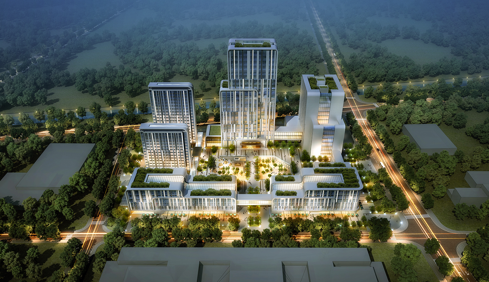 建筑圍合共享的中間庭院,庭院采用新中式風(fēng)格,屋頂設(shè)計(jì)屋頂花園,靜謐淡雅,為人們提供一個(gè)安靜休憩空間。