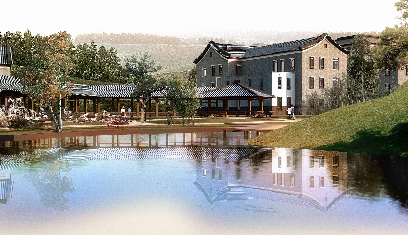 在構(gòu)思和總體布局上引入“潛龍情節(jié)”。結(jié)合用地南北狹長(zhǎng)、北面臨海的地形特征和自由靈活的建筑布局,將中華民族的文化象征——龍圖騰與傳統(tǒng)文化的燦爛之花——書(shū)畫(huà)藝術(shù)相結(jié)合,將主要軸線以龍為形,寓意著書(shū)畫(huà)藝術(shù)的振興和華夏文化的騰飛。