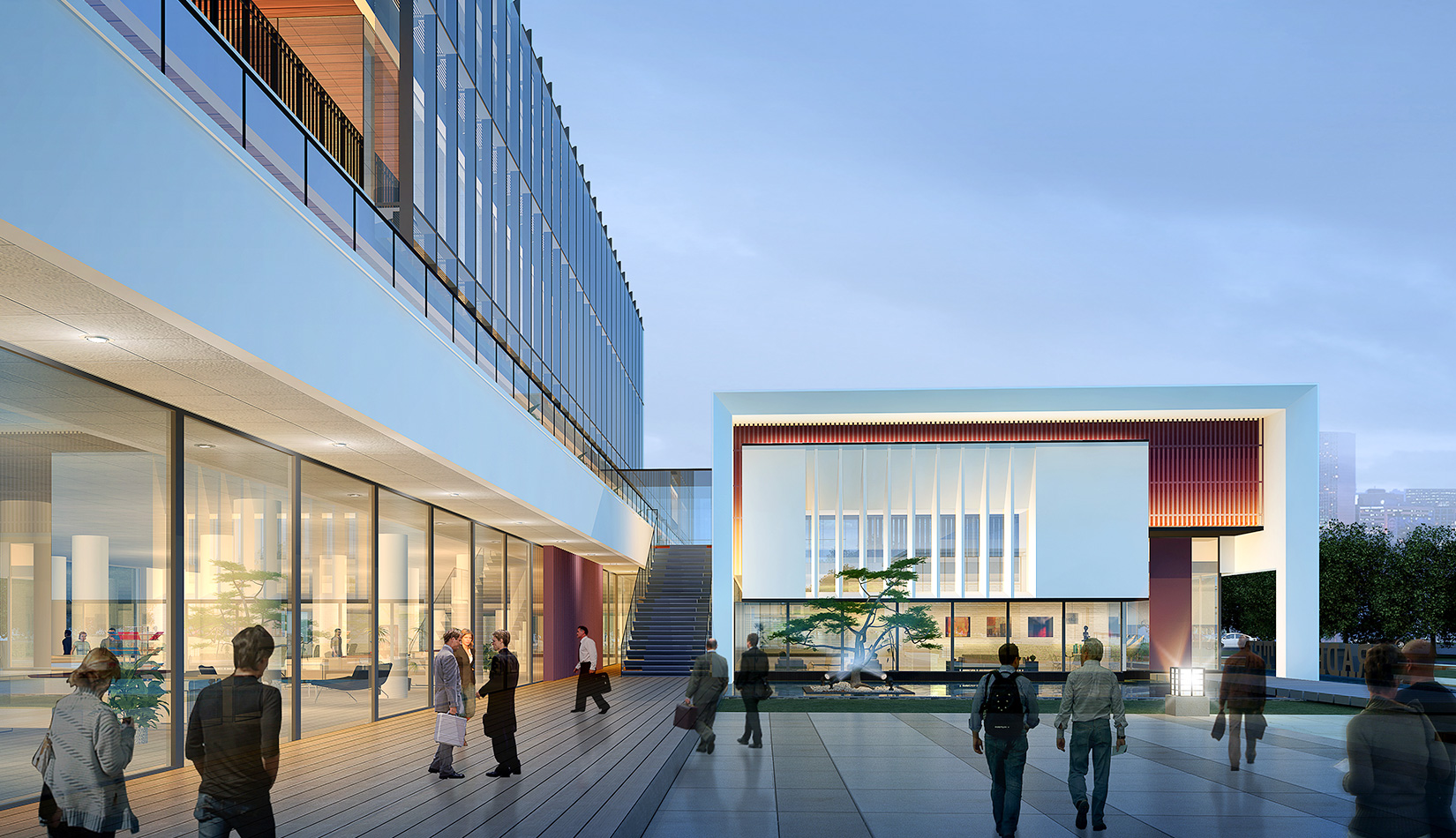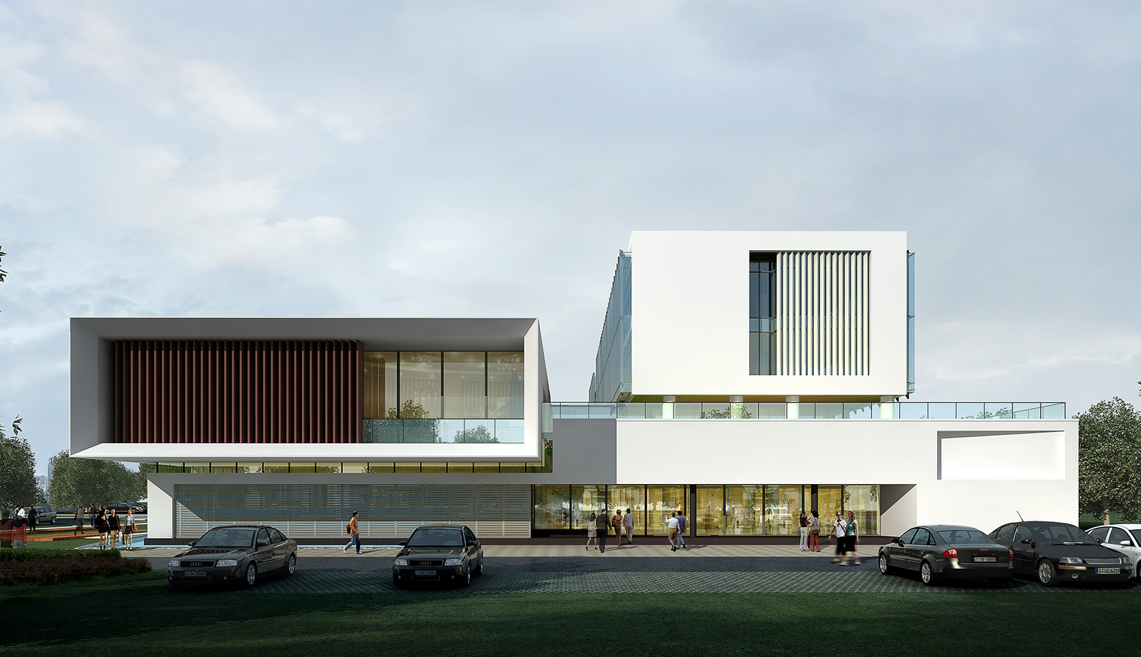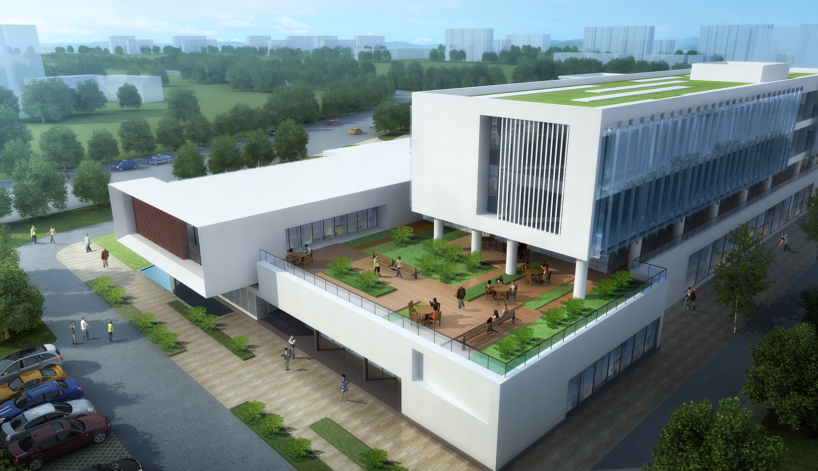 作為中韓貿(mào)易合作區(qū)一期啟動區(qū)的重點(diǎn)項(xiàng)目,其承擔(dān)著對外展示以及為后續(xù)發(fā)展提供服務(wù)平臺的功能。因此設(shè)計力求穩(wěn)重大氣,以4 層的體量打造出地標(biāo)性的建筑。設(shè)計運(yùn)用簡潔的外形、寧靜的色彩,外立面以白色涂料和木格柵為主,尊重自然,打造一種平和寧靜的感覺。在空間設(shè)計上通過共享空間、上人露臺和一層大平臺,創(chuàng)造出舒適宜人的工作環(huán)境;在技術(shù)上通過地源熱泵、呼吸式幕墻、雨水收集等的應(yīng)用,實(shí)現(xiàn)建筑的綠色節(jié)能環(huán)保。